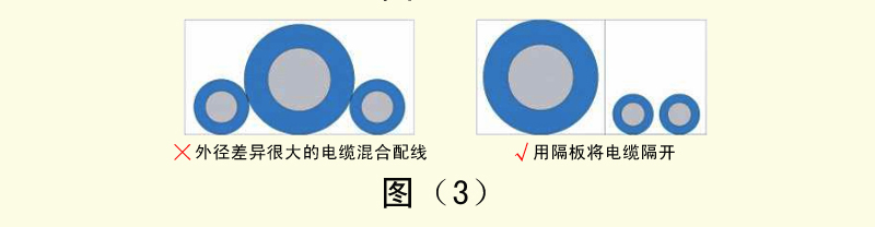 4、外徑差異很大的電纜如果混合配線,容易導(dǎo)致細(xì)線被粗線壓迫,造成細(xì)線容易斷線。這時(shí)需要用隔板將電纜隔開(kāi)。如圖(3)wpc拖鏈電纜-聚氨酯卷筒電纜-高柔性坦克鏈電纜廠家