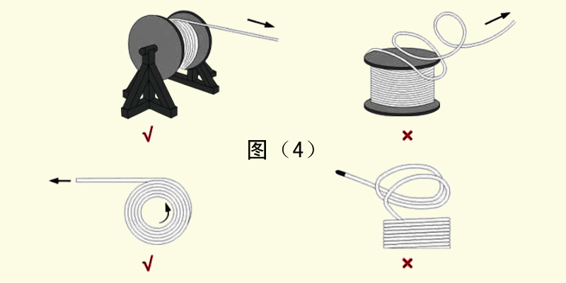 5、拖鏈電纜在敷設(shè)中不能扭曲,即不可直接從電纜卷筒或電纜盤(pán)上拉出,而應(yīng)旋轉(zhuǎn)短筒或者電纜盤(pán)將電纜展開(kāi)。如圖(4)wpc拖鏈電纜-聚氨酯卷筒電纜-高柔性坦克鏈電纜廠家